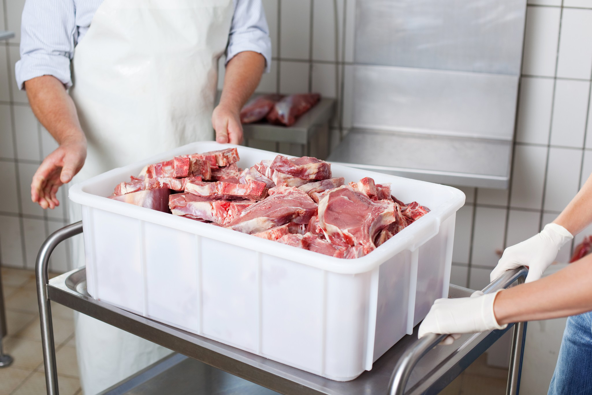 | Unverpackte Produkte (frühe Prozessstufe) | Fleisch in Kisten (E2) | Rohfleisch in Transportkisten |