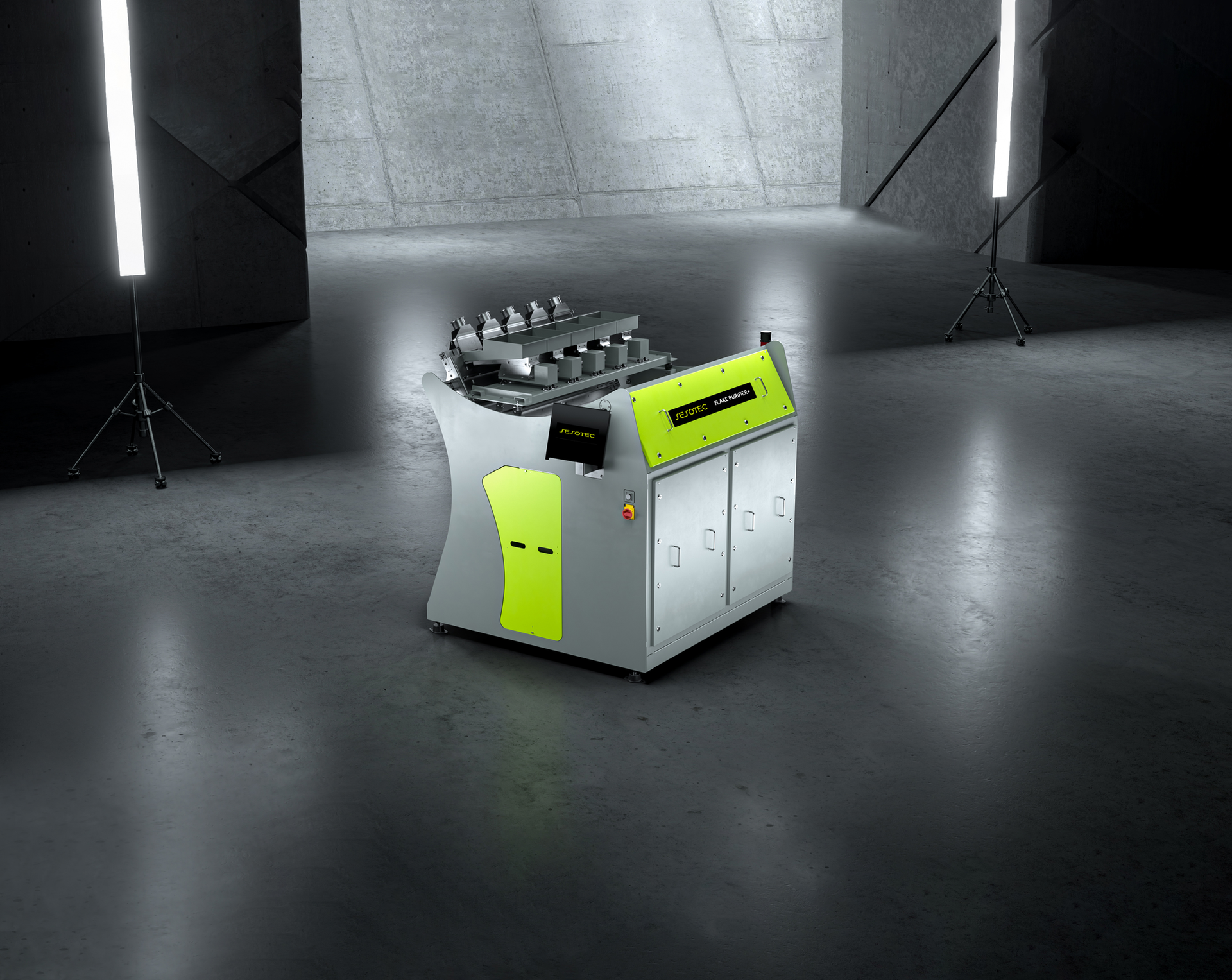 The sorted packaging was then shredded into flakes, screened, and washed. The Sesotec sorting system, FLAKE PURIFIER+, ensured precise sorting of the plastic flake fractions. Each fraction underwent additional purification, reliably removing any remaining off-colors, metals, and incorrect plastics with the FLAKE PURIFIER+.
