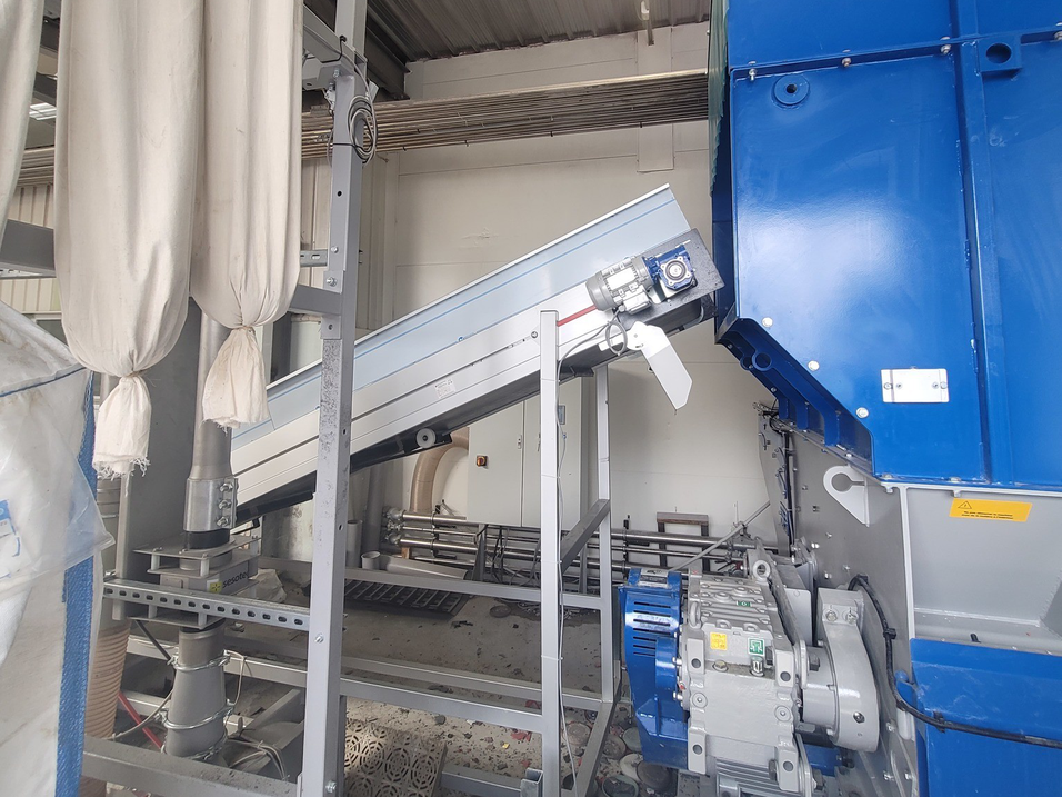 Tras un análisis minucioso del proyecto, se optó por una planta de reciclaje que combina trituradora y desmenuzadora de plásticos en una sola máquina. Esta solución integral requiere poco espacio y al mismo tiempo logra la reducción de volumen deseada.